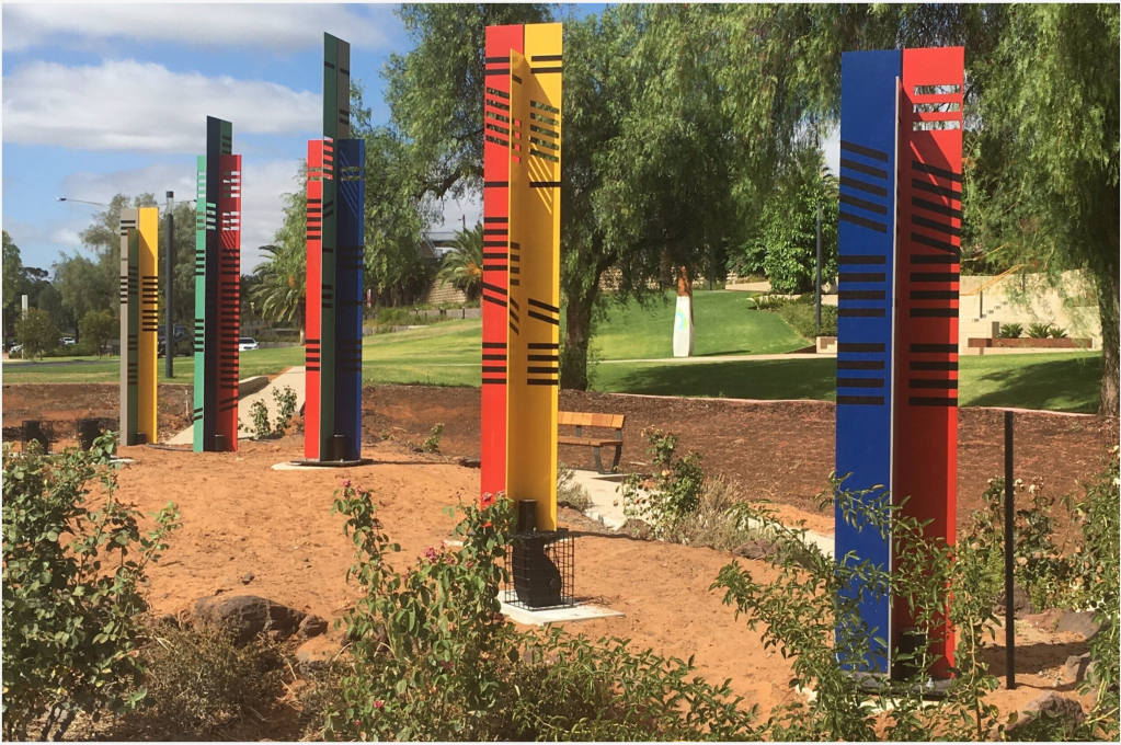 Breath Pattern is described as a ‘five element vertical sculpture with sound installation’ which was created by Paul Carter and sound artist Christopher Williams. Located in the Hyder Garden near the river, which was originally intended for visually impaired people.